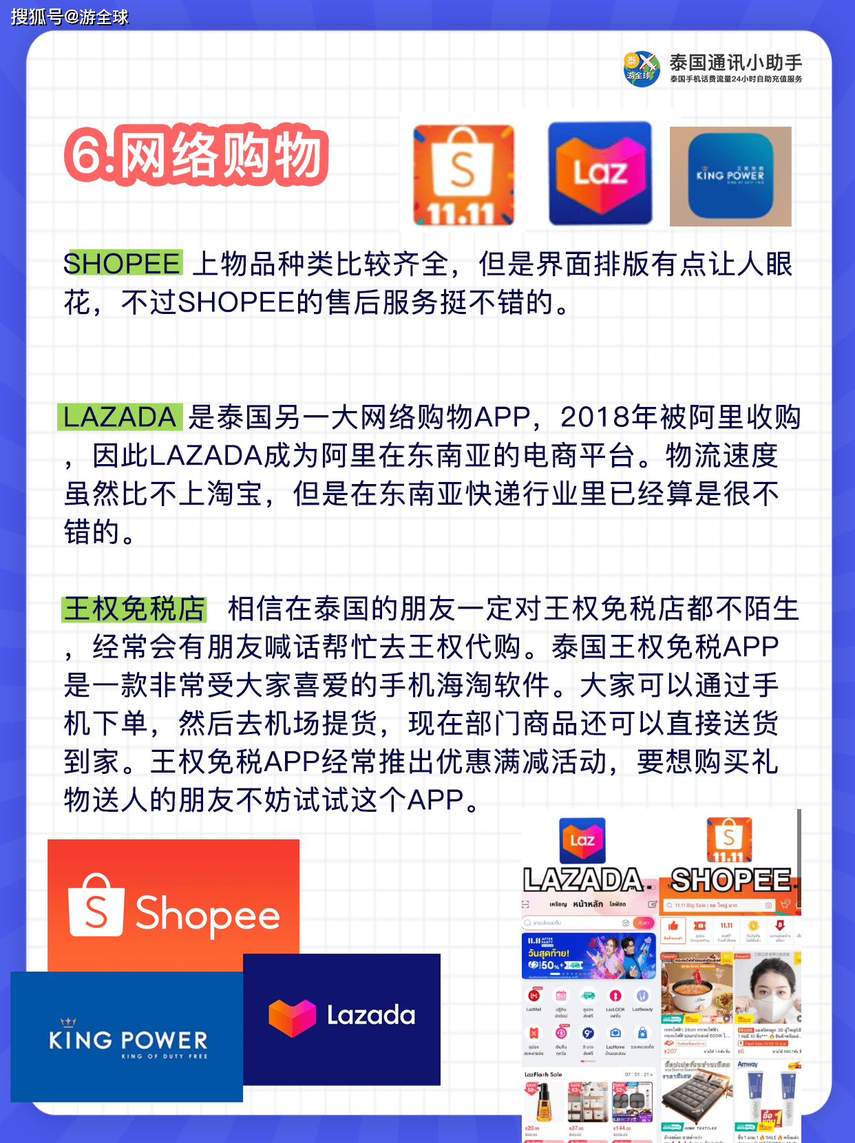 网购: Shopee:虾皮网,类似于国内的淘宝 Lazada: 走高端路线,倾向于突出品牌形象,类似于天猫