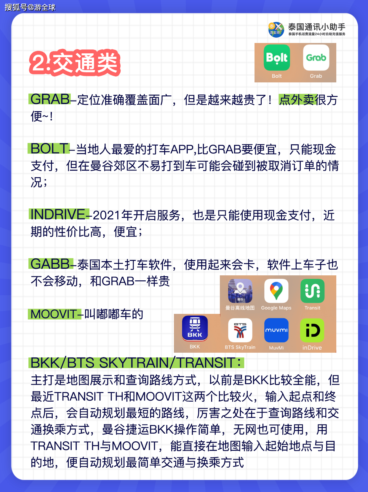 交通出行类: 1.Grab:打车、叫外卖和配送物品 2.Bolt: 价格有时候比Grab便宜一些 3. BKK Rail:曼谷的地铁APP,有BTS、MRT、机场快线的全线地图,可以在APP上查询车费和站点信息 4.Google地图(苹果自带的地图也可以) 5.ViaBus:公交车APP,泰国公交车没有站牌,报站也不清晰,有app比较方便