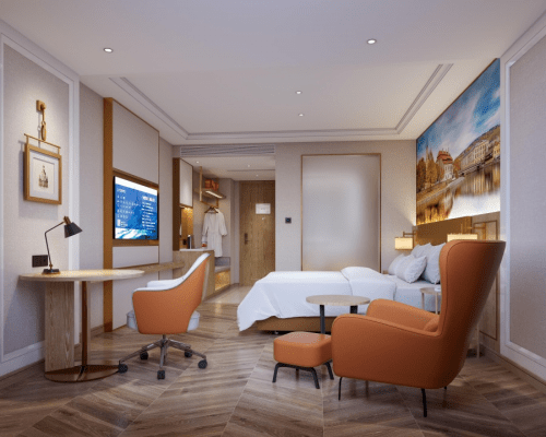首先在产品上。维也纳酒店V5.0在延续原有欧式风格的基础上更为简约,同时融合音乐、艺术、绘画、雕塑等经典元素以及时尚现代的设计元素,形成了具有差异化的简欧美学空间,更符合当下消费主体的审美。同时为了满足消费者对智能化的需求,维也纳就V5.0一方面将不失温度的前台自助入住、智能机器人服务以及智能睡眠客房等智能化服务融入空间,另一方面其与现代数字客控相结合,打造更为智能化的酒店场景,提升用户出行体验。