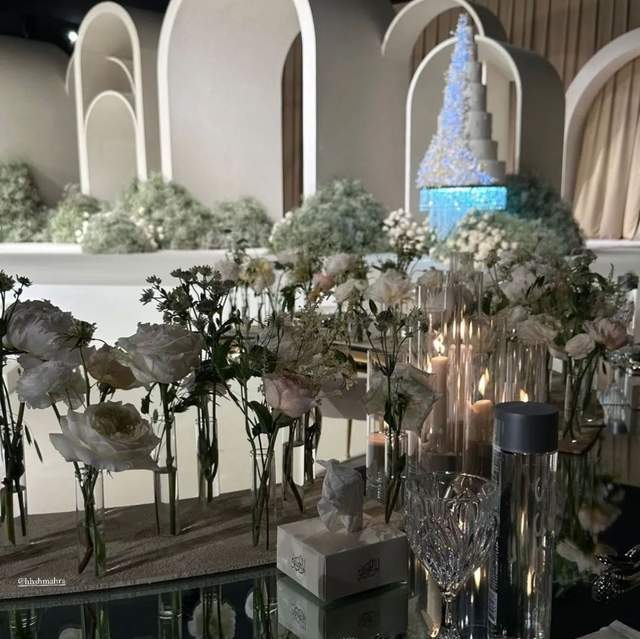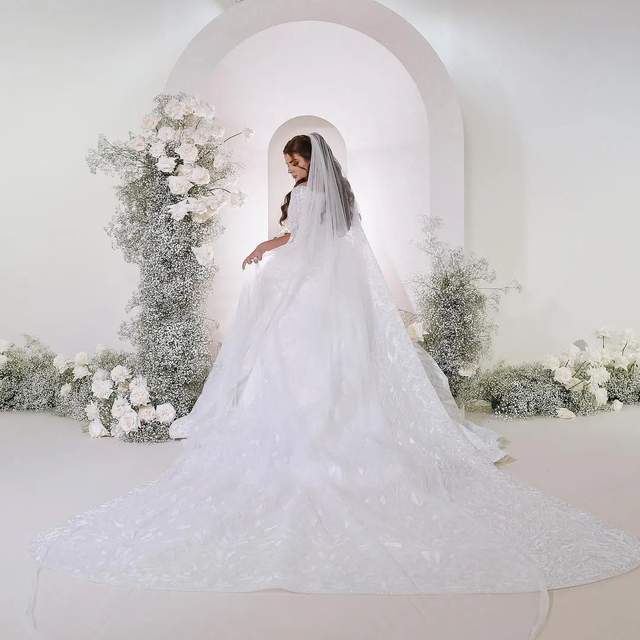 新娘则是西式打扮,纯白婚纱由迪拜本土品牌Ezra Couture手工定制,通体缀满钉珠亮片,刺绣大拖尾如梦如幻↓