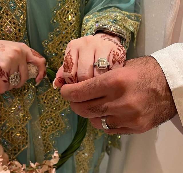 新人的礼服也是一个传统一个现代,新郎戴头巾穿长袍,手上的钻表疑似百达翡丽鹦鹉螺,土豪本豪↓