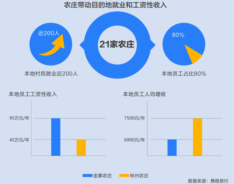 在增加乡村就业岗位方面,携程度假农庄也发挥着越来越重要的作用。截至2022年底,21家携程度假农庄,共吸纳所在地区的村民就业近200人,本地村民占农庄总员工数的80%以上。在带动村民增收方面,以携程度假农庄公益店为例,2022年,携程度假农庄安徽金寨大湾店本地从业人员工资性收入约为95万元/年,本地员工人均增收6900元/年。携程度假农庄河南安阳林州石板岩店本地从业人员工资性收入约45万元/年, 本地员工人均增收约7500元/年。