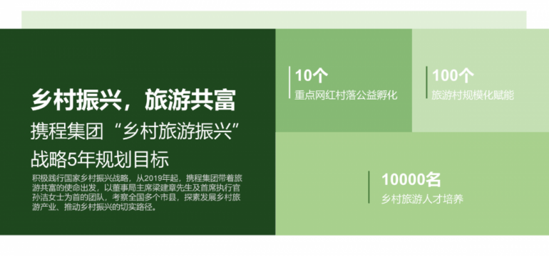 为践行国家乡村振兴战略,担当企业使命。携程提出五年内由携程公益基金以扶贫和振兴为目的孵化10个网红村落,借助携程度假农庄以及携程目的地营销联合整个区域内的旅游资源来打造100个乡村目的地。