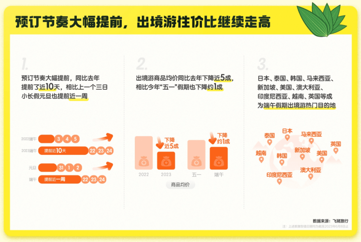 降价的还有出境游文旅产品。飞猪大数据报告显示,出境游商品支付均价相较于“五一”假期下降了10%左右。游客青睐的目的地也在发生着变化,日韩以及欧洲、非洲的部分国家端午假期的出游预订量狂飙,日本已超过泰国,成为最热门的出境游目的地。