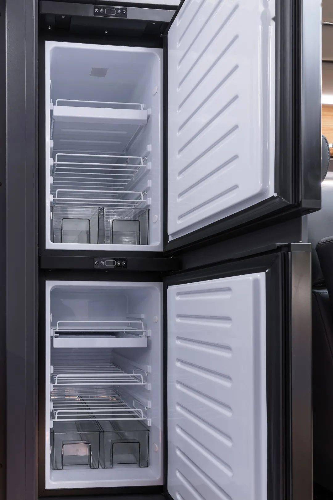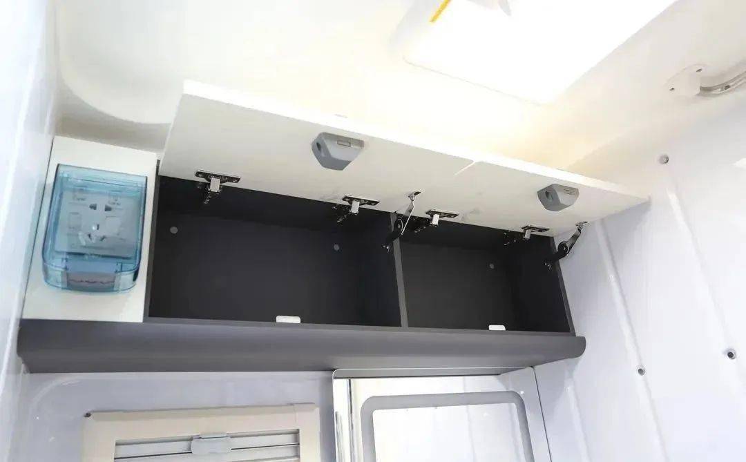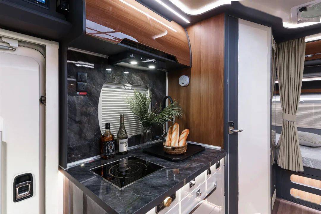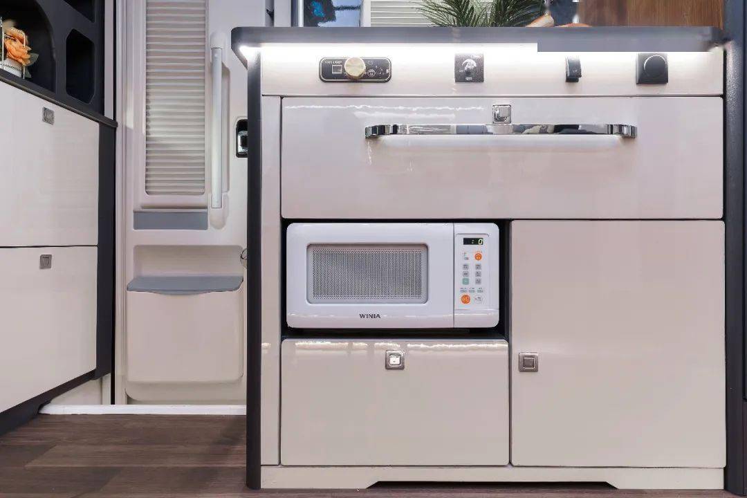 车内电器一站式配齐,空调、洗衣机、冰箱、电磁炉、烤箱、抽油烟机......品牌电器保障高质量旅居生活。宽大敞亮的厨房操作台面,在吃不惯外面饭菜的时候,在思念某种味道的时候,一个厨房带给人家的温馨,是旅途中家人营养均衡的后勤保障。