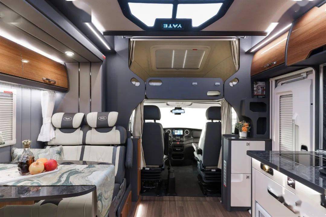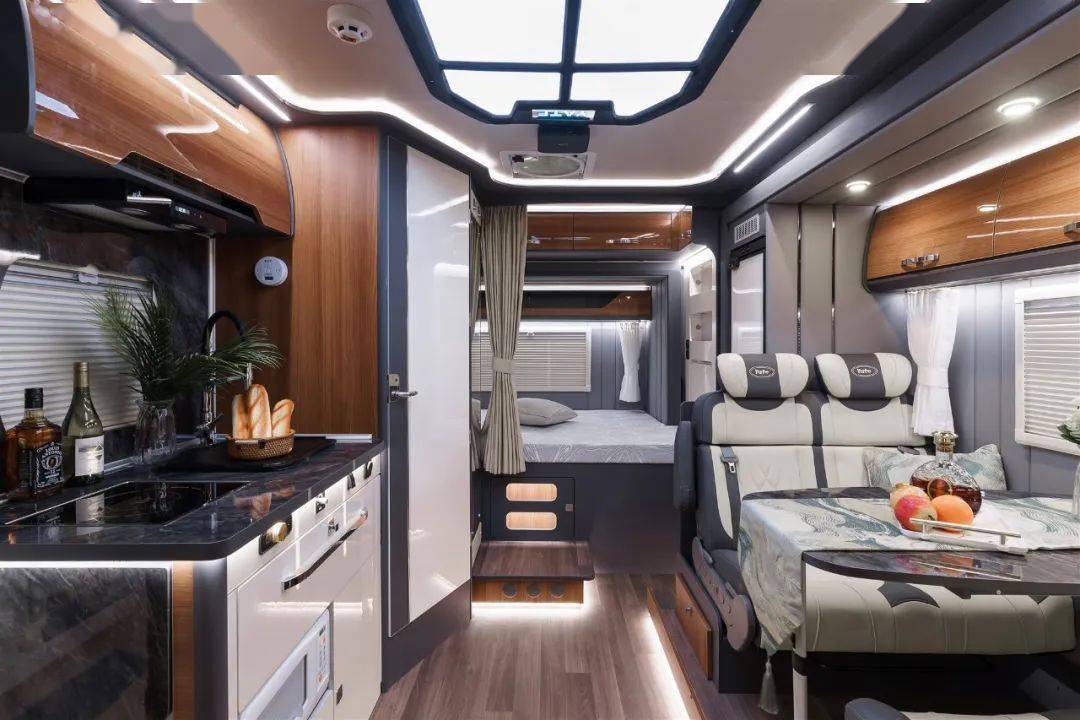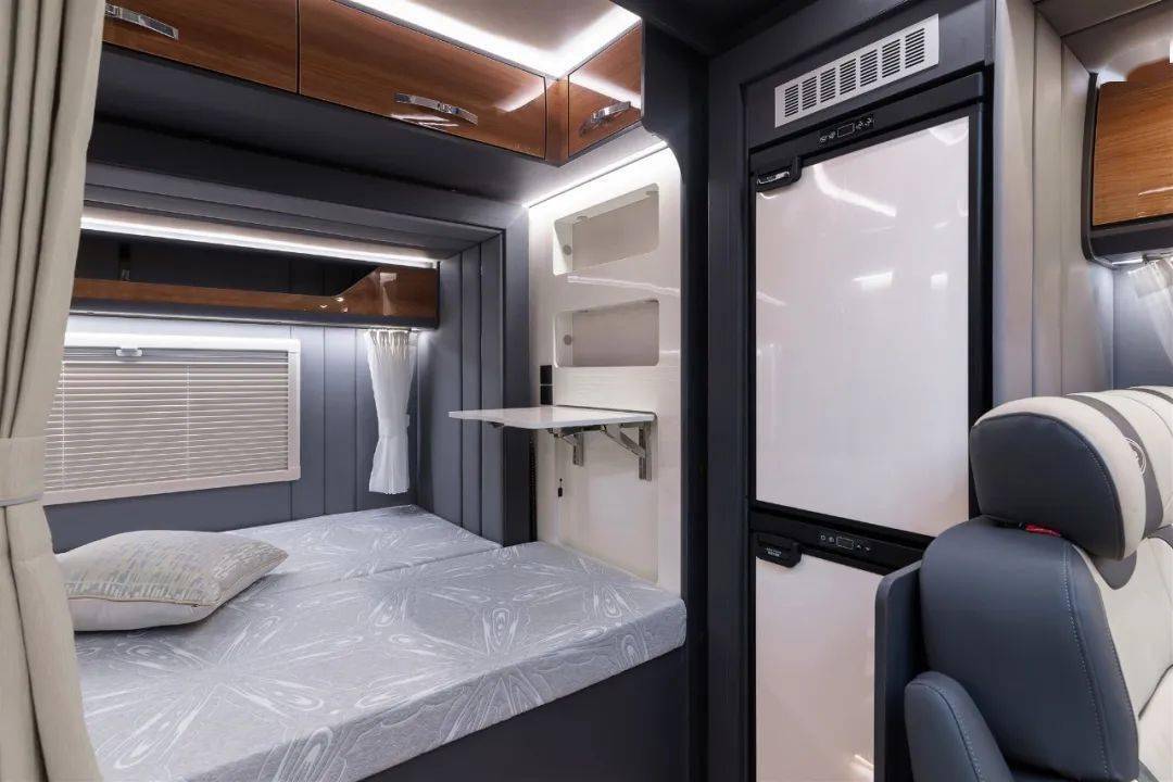 亚特尊领ST PRO的生活区可以说完全不输星级酒店。以大量高级灰和高亮白色系搭配的“简奢风”设计风格,搭配深色亮面吊柜门,营造出简约高级的氛围,无论是老人用户还是年轻群体都能接受。车内共有三张床位可供休息,分别是额头双人床、车尾双人床以及会客区卡座拼床,一家人出行有足够的睡眠空间,丝毫不显局促,人员日常活动区域墙面全部采用软包处理,温暖、隔音、柔软防磕碰,最贴心的享受可以贯穿整个旅程。