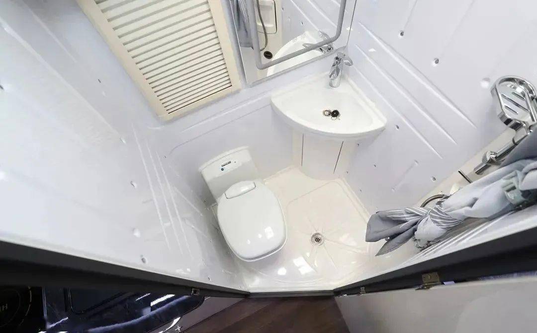 亚特尊领ST PRO的卫生间采用一体式吸塑开模设计,打开灯光,内部非常明亮且好打理。卫生间内部空间近似1平方米,在双拓展车型中算是较为宽敞的设计,配有进口抽拉盒式马桶、集成式豪华卫浴系统、房车专用洗手盆、房车专用双向防雨换气扇、LED智能防雾浴室镜、吊柜等,有限的空间里达到星级酒店的标准,还贴心地设置了暖风出风口,保障家人温暖沐浴。