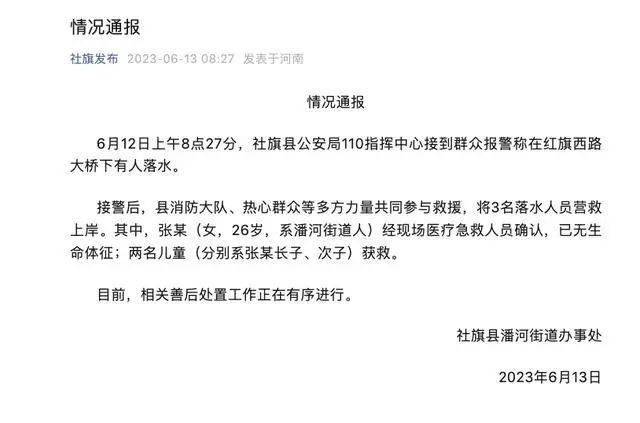 6月13日,河南南阳社旗县潘河街道办事处通报:6月12日上午8点27分,社旗县公安局110指挥中心接到群众报警称在红旗西路大桥下有人落水。