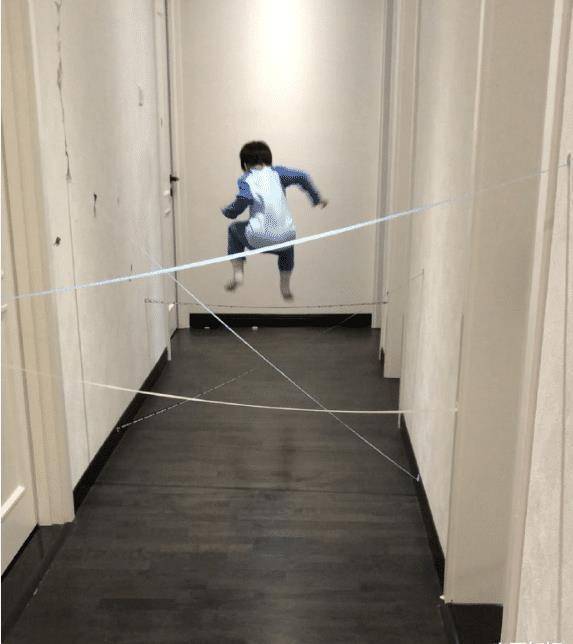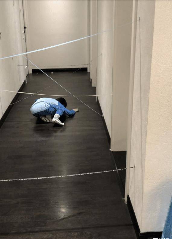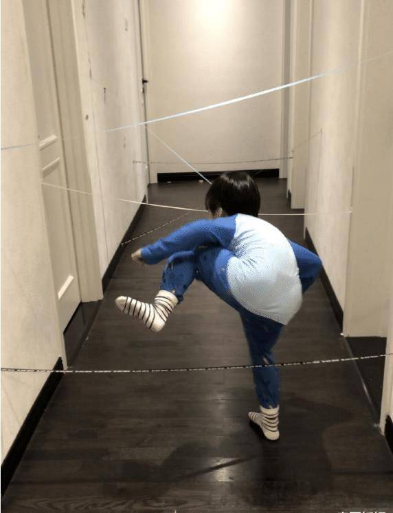 谢楠家已经被她布置成游乐场,只看到吴所谓在开心地玩耍,欢乐无比。没看到弟弟,一定是呆在一旁先看看哥哥怎么玩,然后在加入其中吧。吴所谓一身睡衣,在各种“警戒线”中钻、跳、跑……像个快乐的小猴子一样。身手是相当的灵活,颇有爸爸吴京的风范。