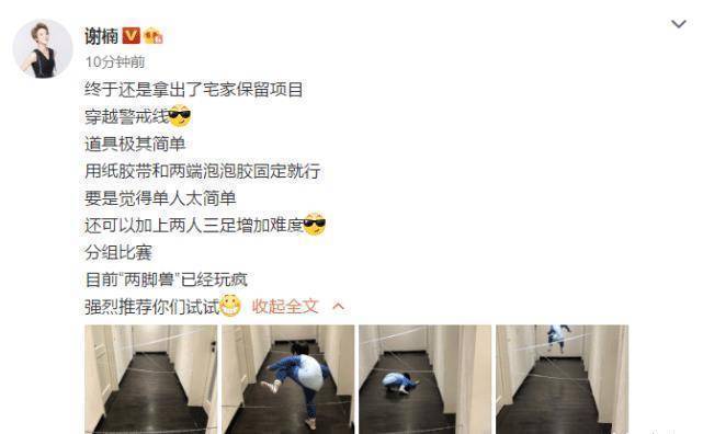2022年1月25日,谢楠晒出大儿子吴所谓玩耍的照片,配文解释:“终于还是拿出了宅家保留项目 穿越警戒线 道具极其简单 用纸胶带和两端泡泡胶固定就行 要是觉得单人太简单 还可以加上两人三足增加难度 分组比赛 目前“两脚兽”已经玩疯 强烈推荐你们试试”。