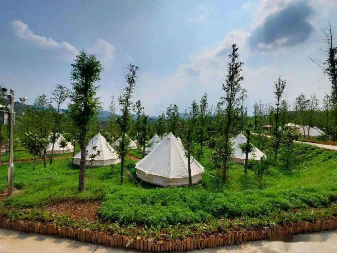 周边群山环绕,森林覆盖率达80%以上,配有可供游客使用帐篷、房车、移动别墅等露营设施。露营地基础设施完备,水电齐全,有星级餐厅和自助餐厅,价格亲民,让游客享受吃住娱购一站式露营体验。