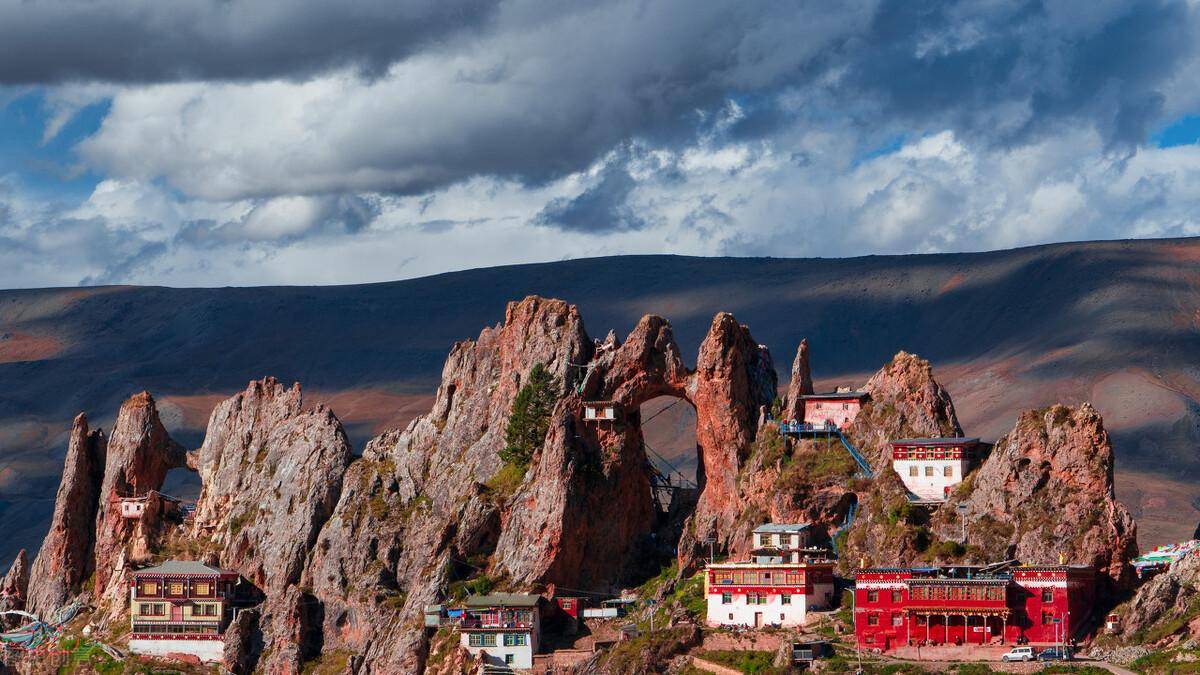 星罗棋布的藏式建筑全都建在峭壁之上,与峭壁融为一体,像是从山体里长出来的。在云雾里,只露出山头上的红房子,仿若天空之城。透过石洞天门,能看到藏东的丹霞地貌。这里的人,相当于常年生活在玉龙雪山的4680的位置。空气里缺氧,但是不缺信仰。