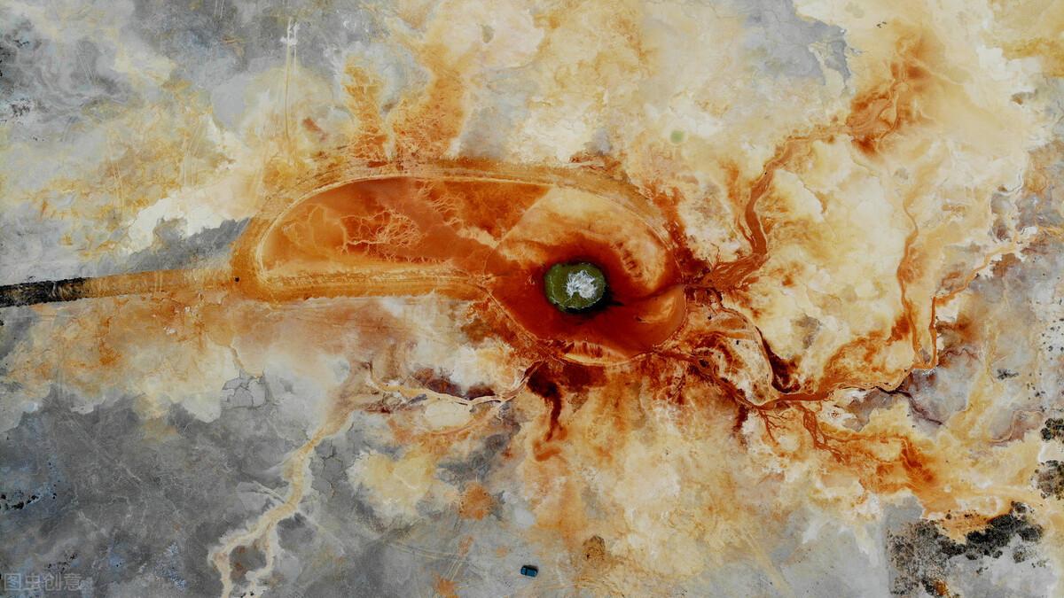 这里适合航拍,近距离观看到的是一滩寸草不生的盐碱地,但是升起无人机,就是一只活着的大地之眼。