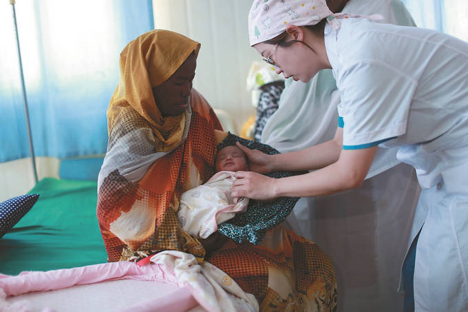 2月22日,中国援苏丹医疗队妇产科医生刘韡在苏丹阿布欧舍医院的病房为一名新生儿做检查。 新华社发 (中国援苏丹医疗队供图)