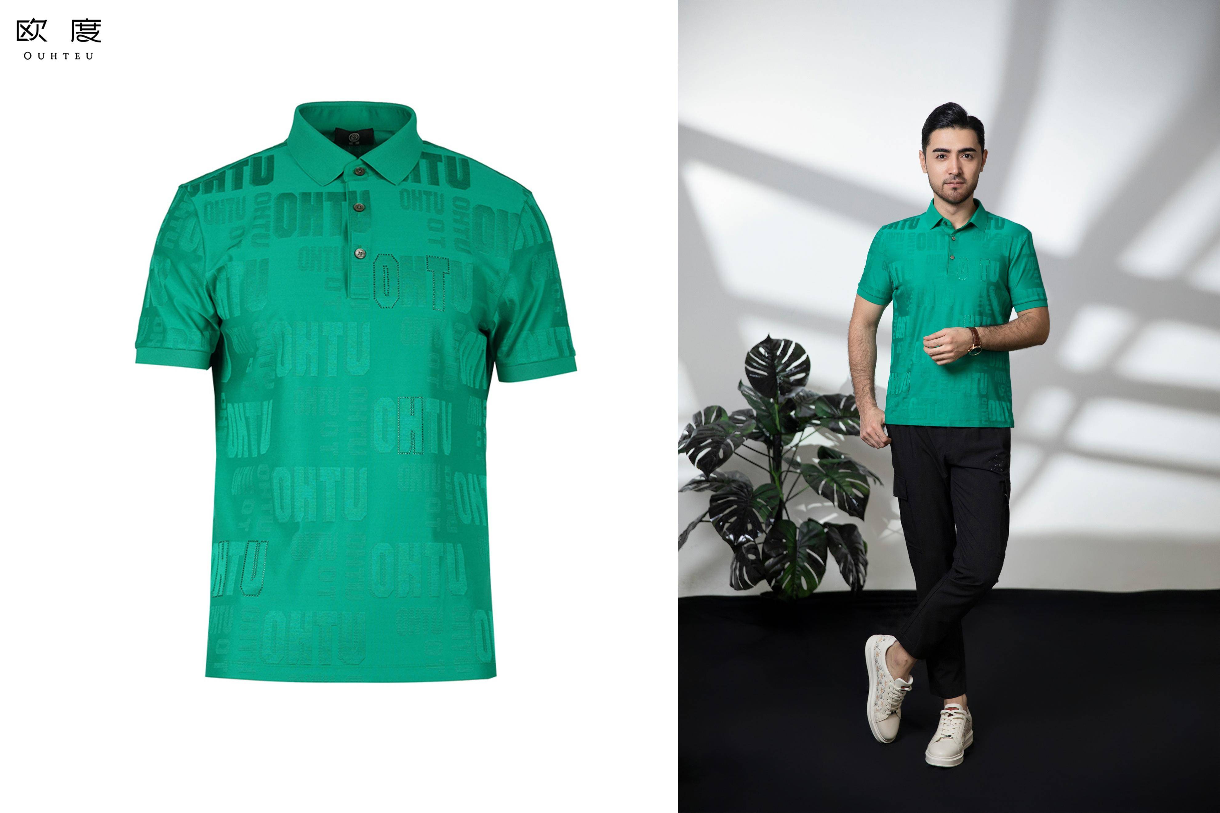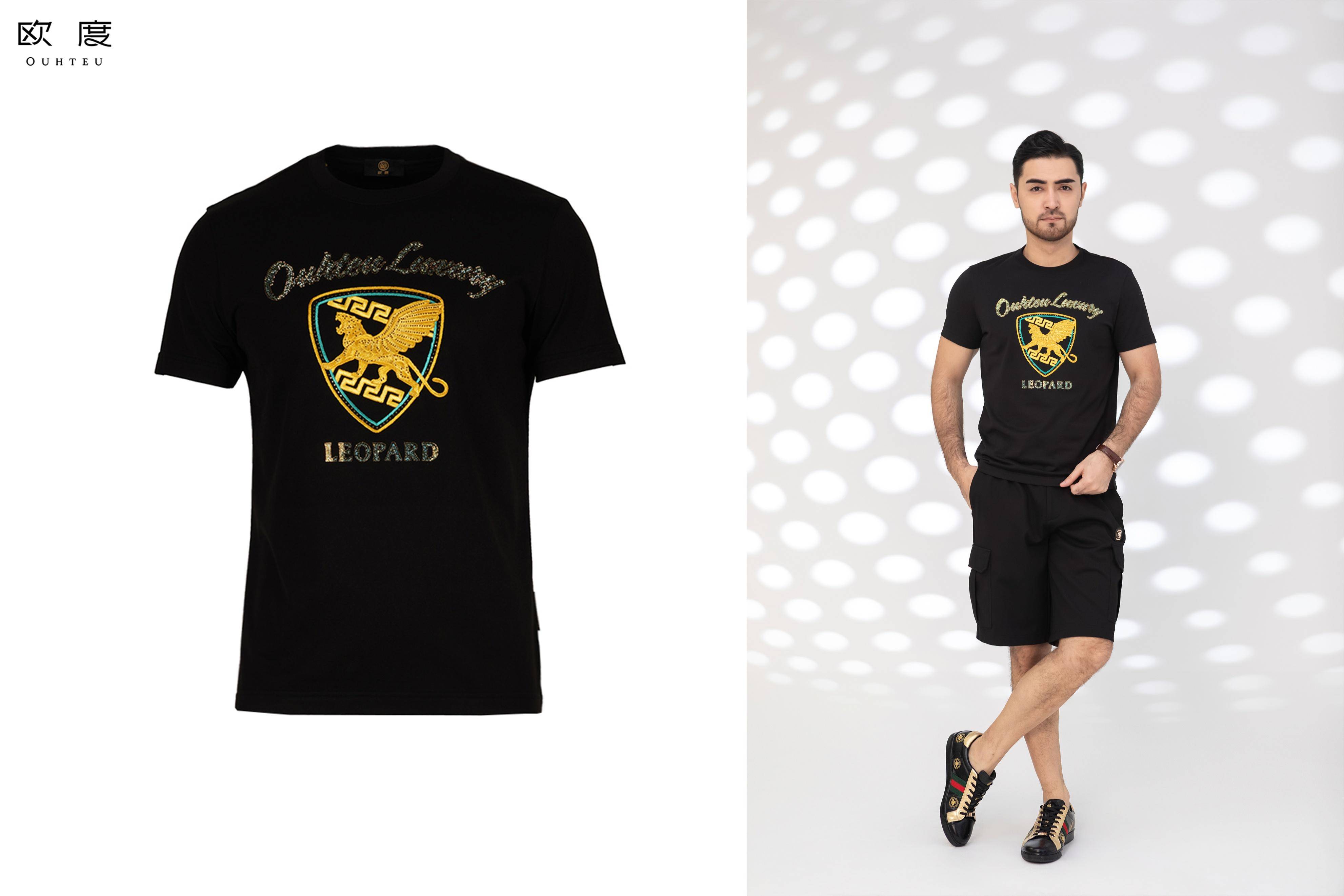 黑色是男装经典色,也是古代中国五正色之一、敦煌壁画代表色。黑色在敦煌壁画中常用来勾勒人物、建筑,或信笔挥洒或精勾细描,可粗犷大胆可细致入微,笔触生动,神韵丰富。欧度2023夏季男装用色中,黑色以深沉庄严的姿态承载其他彩色,传递出不同风格的视觉印象。潮流飞天豹系列中应用黑金配色,利落贵气而不浮夸,黑色的重量感衬托得金色图案更加鲜明,视觉印象深刻。色彩的碰撞,为穿搭带来更多趣味、活泼感和耐看性。