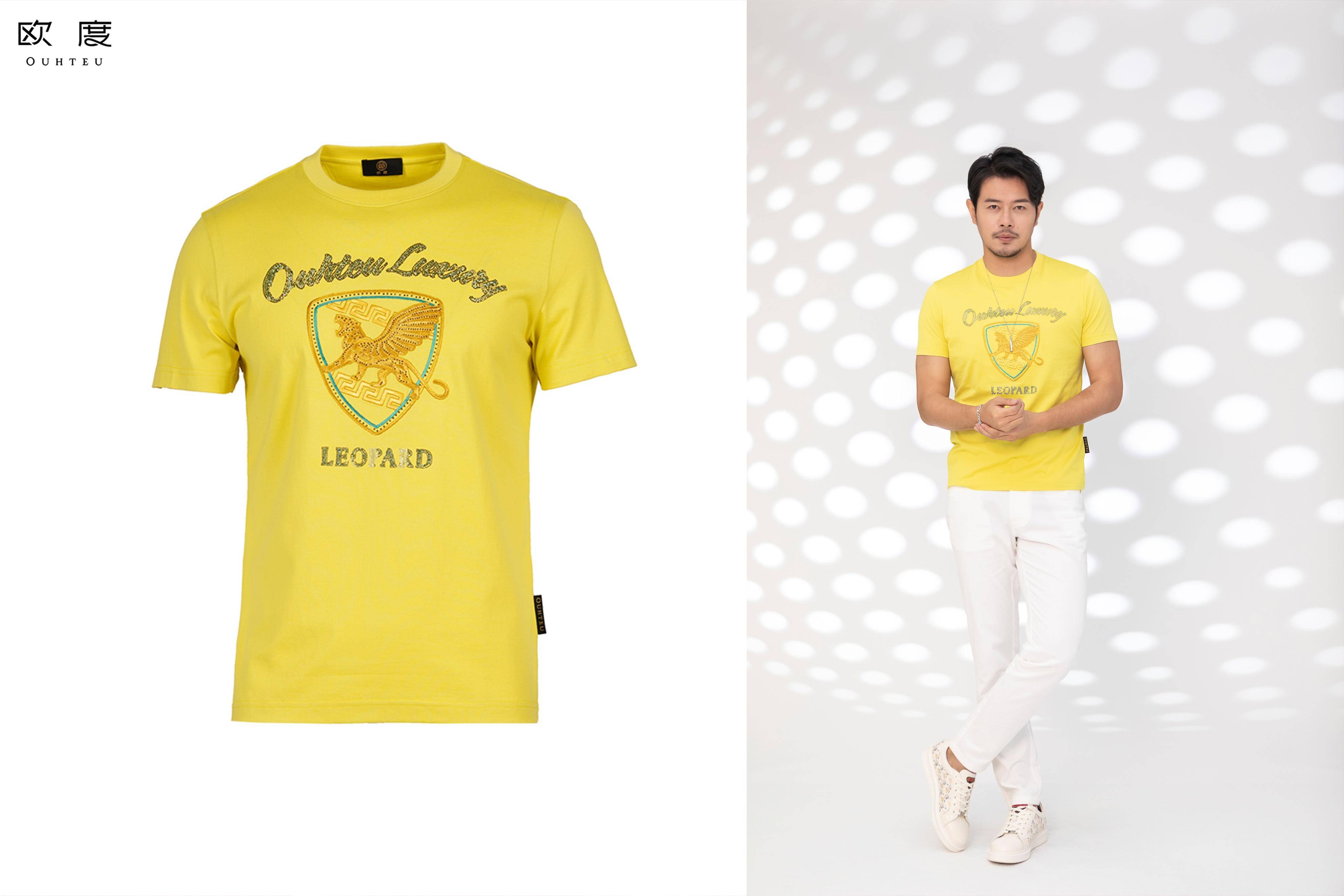中国传统五正色之一的黄色,也是今年男装一大流行色。别看黄色鲜明夺目,在男装穿搭里算小众用色,但夏天里一抹柠檬黄上身,立马变得热情洋溢,衬托得整个人都年轻精神起来。欧度这款圆领T恤,还采用了原创飞天豹设计,国潮韵味满满。飞天豹象征力量、地位、权威,寓意着男士英勇无畏的气概,和不惧挑战的魄力。黄色T恤搭配白色裤装,色彩浅而亮丽,展现出积极向上的生活状态和对未来的坚定追求。