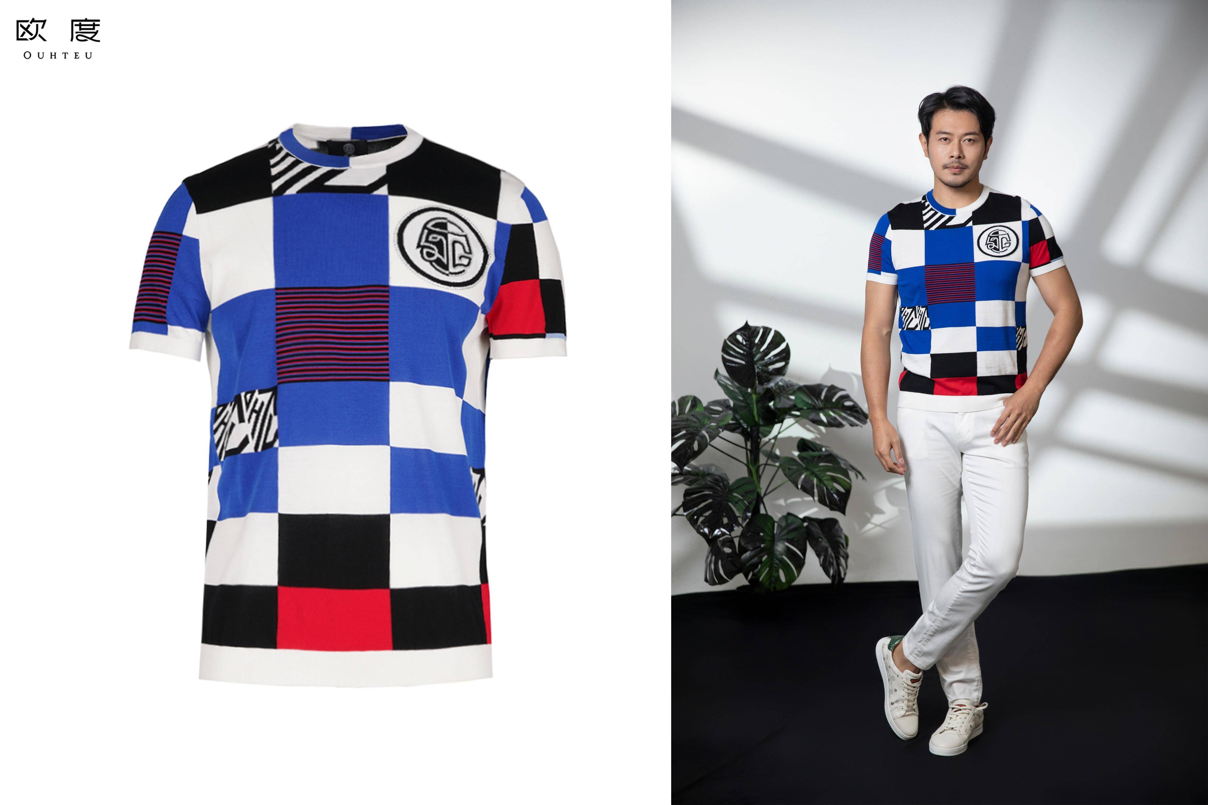 高饱和度的蓝色,冷静之余更多几分大气。融合时下正在流行的棋盘格元素,以及红蓝撞色设计,热情、明亮,充满夏日气息和时尚氛围。撞色圆领短袖搭配轻薄舒适的白色裤装,视觉层次分明,通过感官刺激还有提振精神的效果,风格减龄,个性率真。