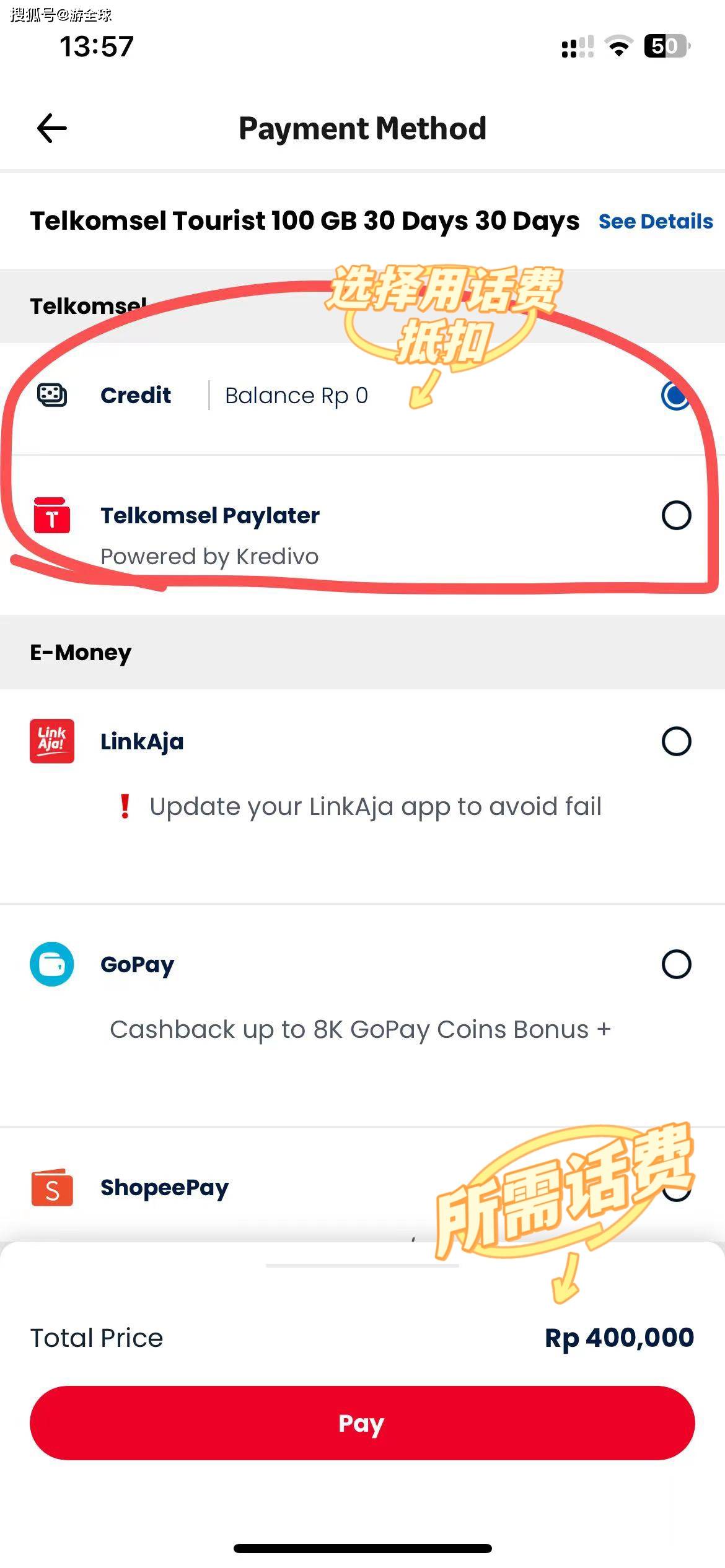 4️⃣或点击图3-在app上点击查看所有流量包/查看所有套餐-选择你想要订阅的流量大小后-查看所需金额💰(注:这里订阅流量的费用是用话费💰来抵扣的)图5-如:我选择了一个30天100G的流量包,所需话费💰Rp400000