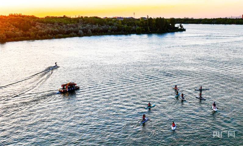 游客在张掖芦水湾生态景区居延湖体验观光画舫、动力冲浪板、sup桨板(央广网发 陈露 摄)