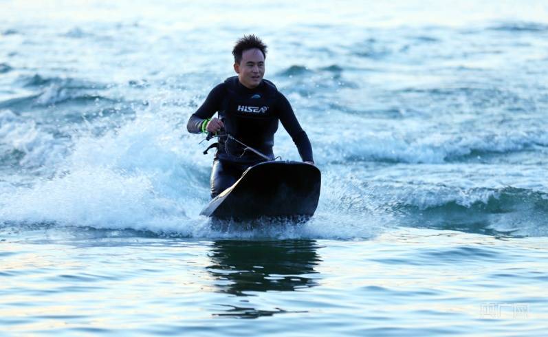 游客在张掖芦水湾生态景区居延湖体验动力冲浪板运动(央广网发 王将 摄)