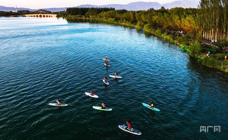 游客在张掖芦水湾生态景区居延湖体验sup桨板运动(央广网发 陈露 摄)