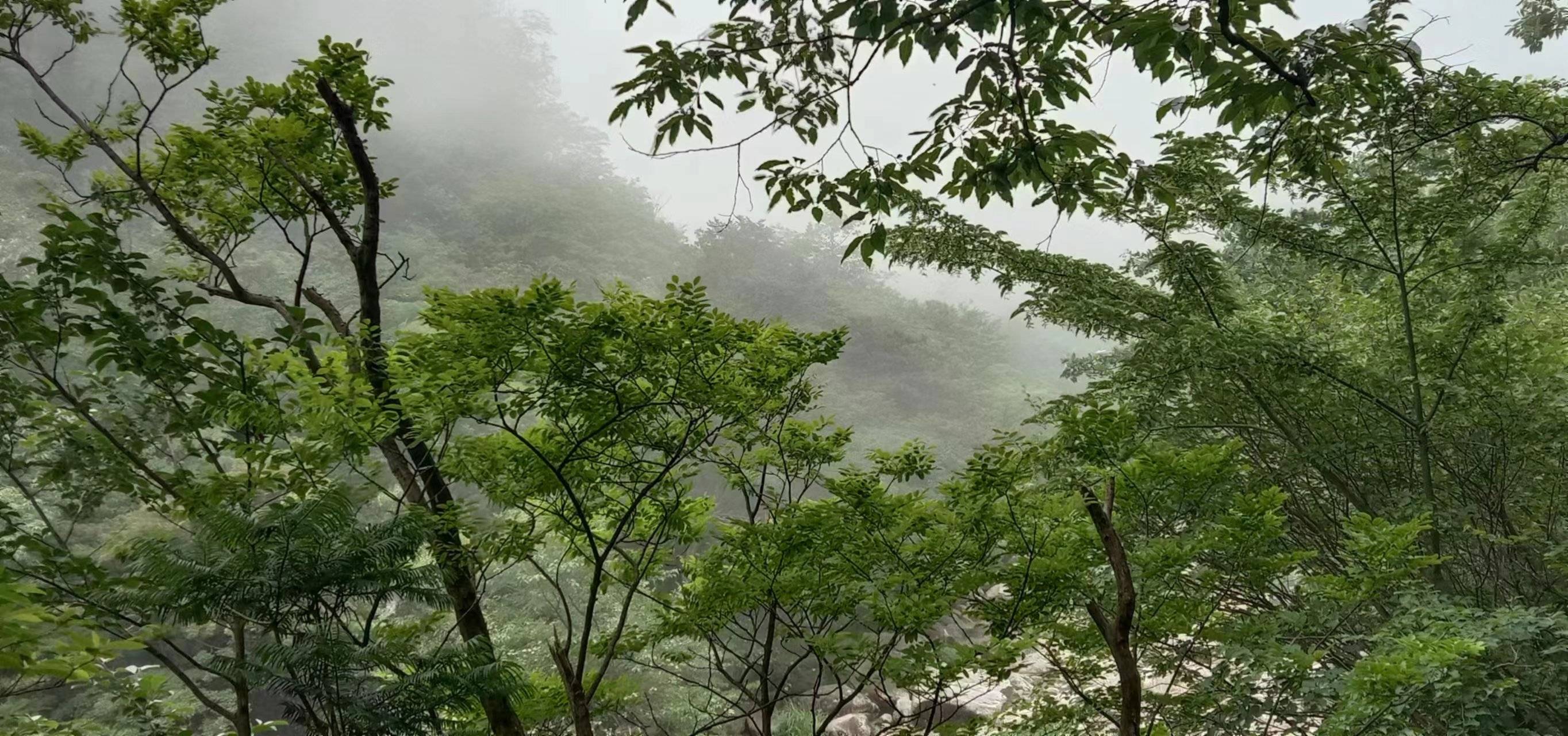 张同学今年出来第五次了,有些体力不支,我们三人走的都汉流夾背,气喘嘘嘘。 坚持就是胜利!曙光就在前方,我们三人走走停停。休息一下,忽儿一片片浓雾袭来,烟岚四起,山色朦胧,怪石间清泉湍流。