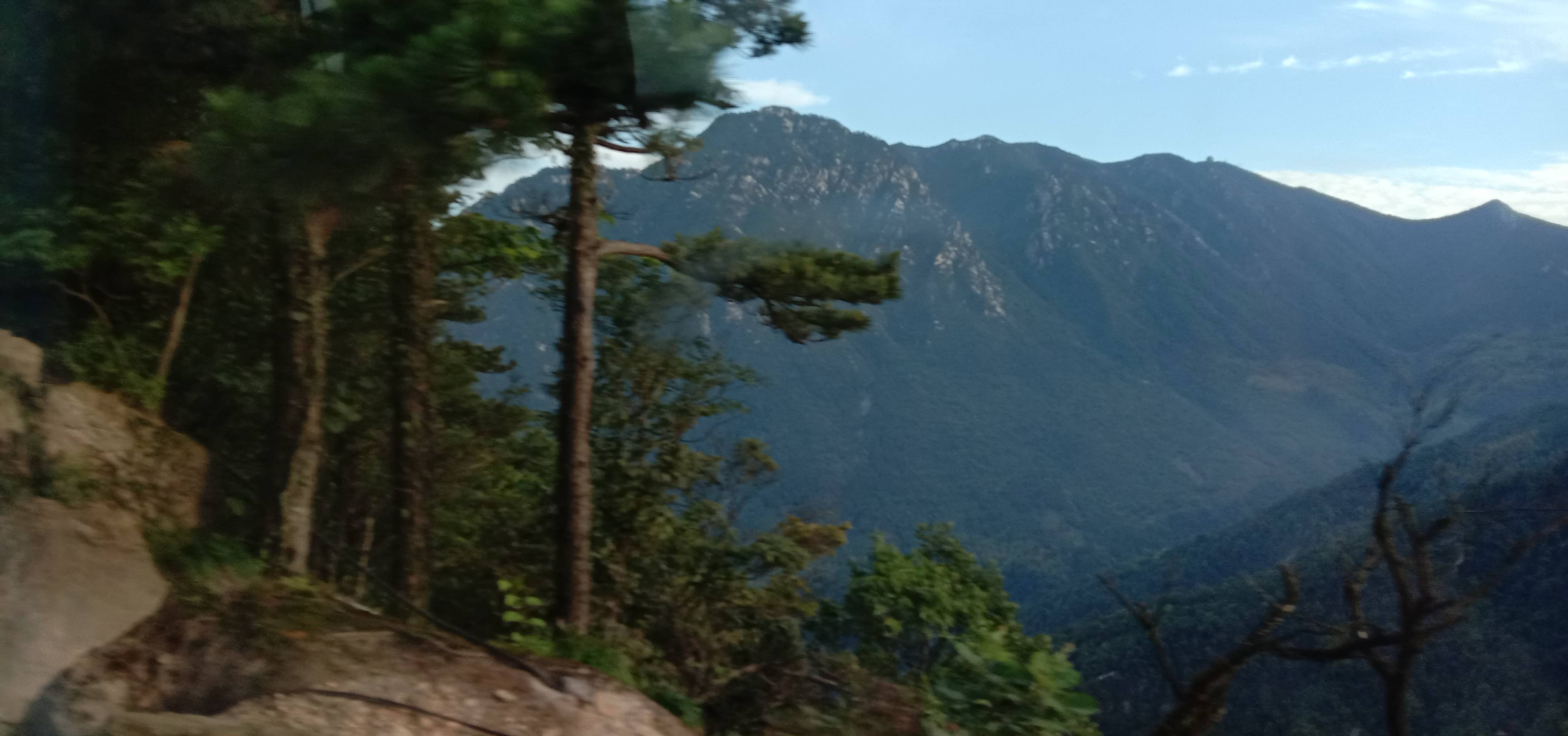 等来了一位四川朋友朱先生。我和张同学,朱先生三人一组山脚下的宾馆休息一晚,养精蓄锐,天一亮就出发。坐摆渡车一路观光,沿盘山公路进发,放眼望去,各种树木繁茂青绿,宛如翡翠,空气非常湿润清新,微风徐来,凉爽怡人。