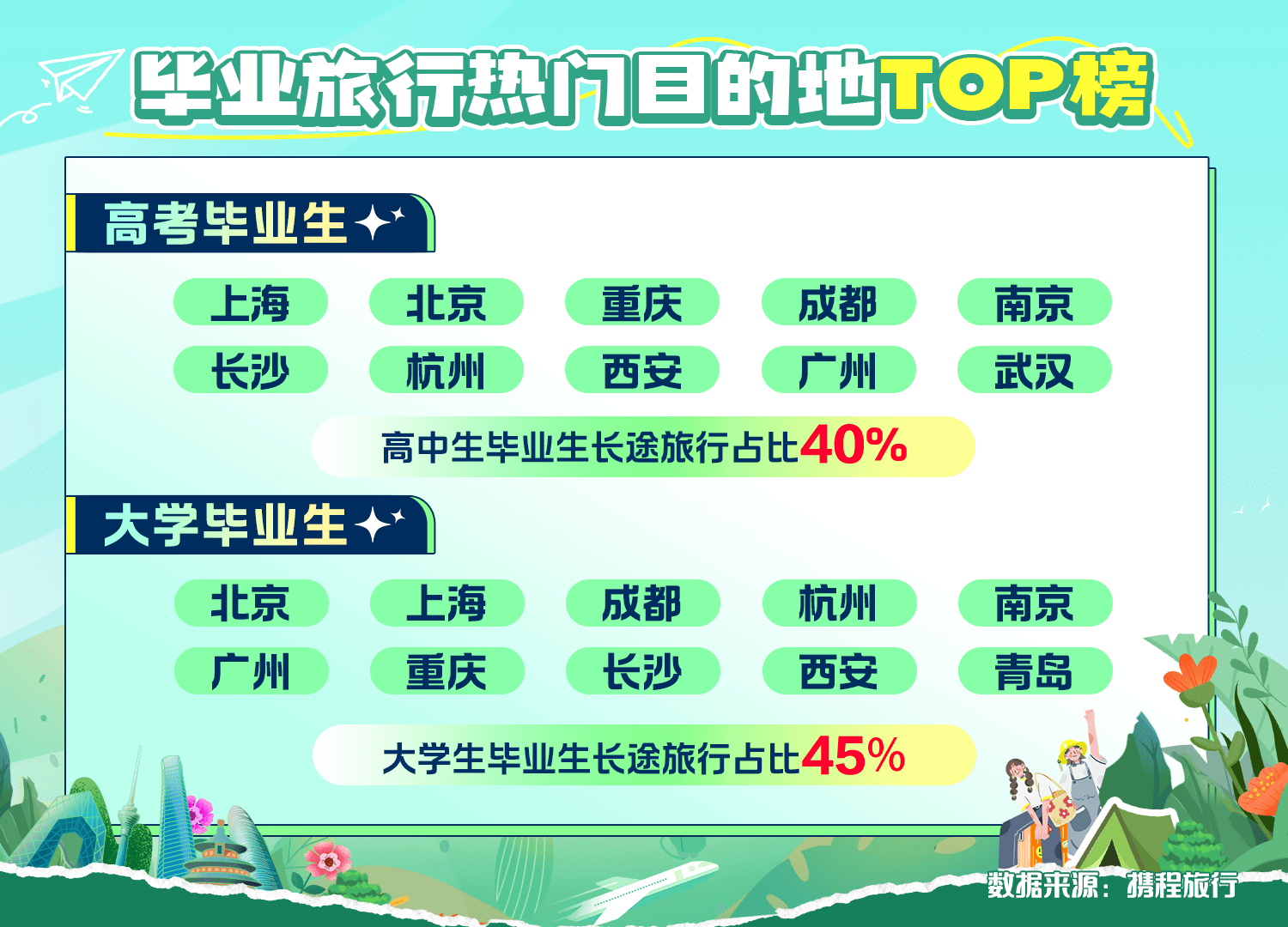 毕业生爱去哪里旅游?今年毕业季,毕业生去看广阔世界的第一步,是前往日常热门网红的旅游城市打卡,高中毕业生和大学毕业生的旅行目的地有所不同。携程数据显示,高中毕业生在6至8月最爱去上海、北京、重庆、成都、南京、长沙、杭州、西安、广州、武汉旅游。而大学毕业生最喜欢去北京、上海、成都、杭州、南京、广州、重庆、长沙、西安和青岛。具备地标属性的超大主题乐园、拥有顶流 “花花”“萌兰”、夜生活与美食撩拨的烟火气浓重、历史人文与现代民谣碰撞出火花……皆是年轻人选择这些目的地的理由。