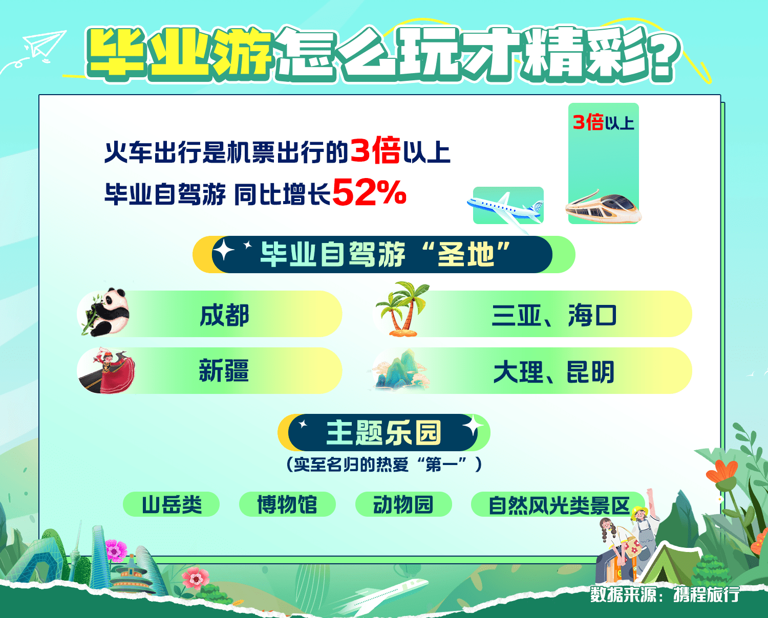 与此同时,今年选择自驾毕业游的年轻人越来越多。今年暑期,携程平台上18-24岁租车用户数量同比增长52%。熊猫之城的成都,海滨城市三亚、海口,拥有独库公路的新疆,以及可以“追风”的大理、昆明成为年轻人毕业自驾游的“圣地”。