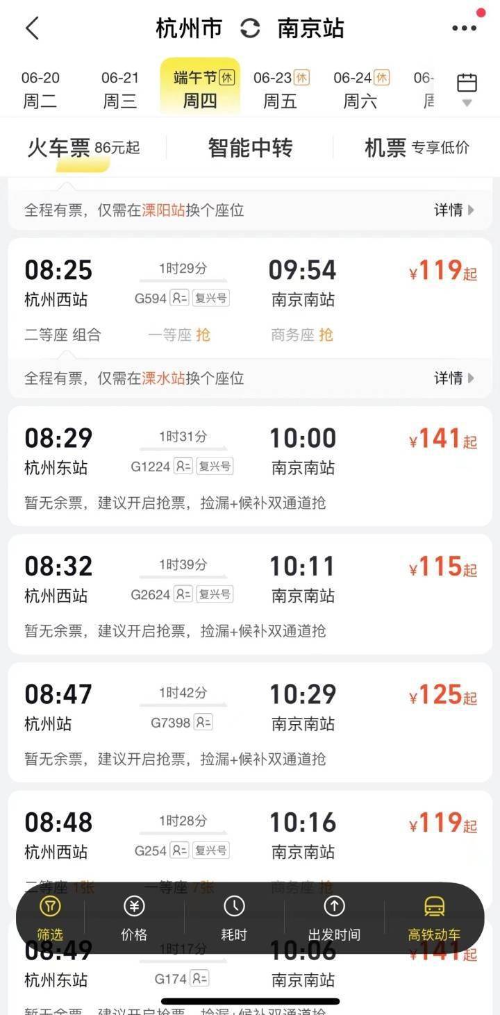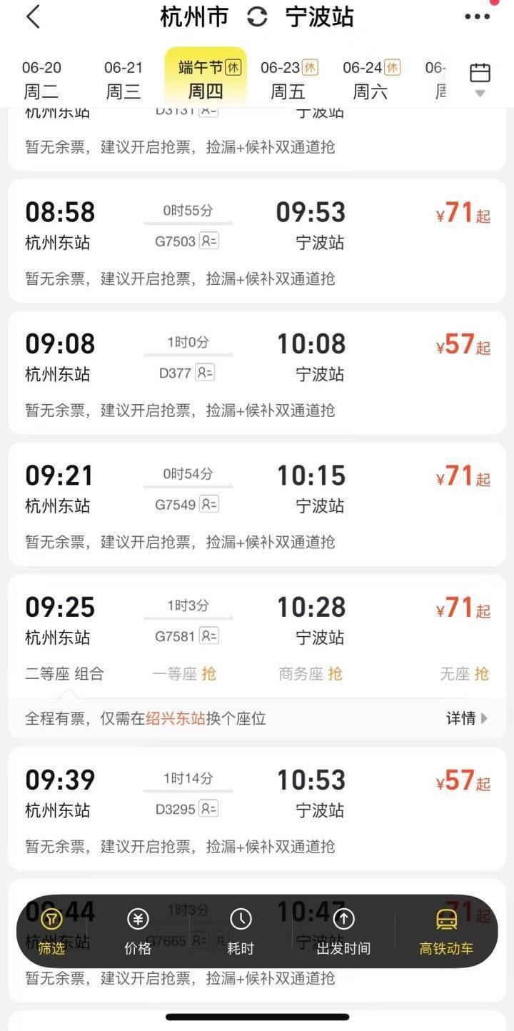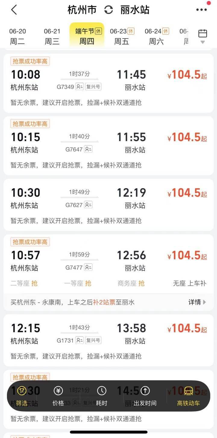 相比远途出游,更多人选择周边两小时交通圈,或者高铁出行。潮新闻记者查询,从杭州出发坐高铁,端午期间热门城市如苏州、南京、宁波、温州、金华、嘉兴、台州、湖州、衢州、丽水等方向基本无票,如果此时还没有买高铁票,可能只能选择自驾出行了。