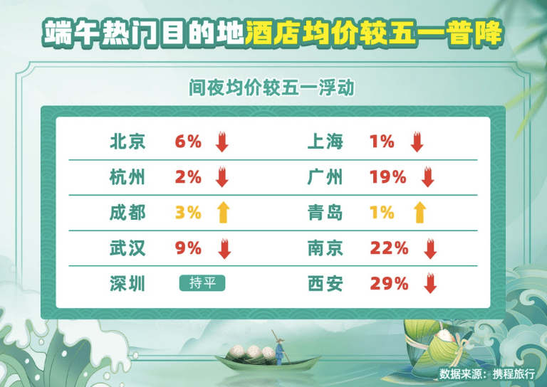 携程数据显示,从目前预订情况来看,端午假期国内热门目的地前十名分别为北京、上海、杭州、广州、成都、青岛、武汉、南京、深圳和西安。这些热门目的地中,多地酒店间夜均价较 五一假期明显降低,例如,西安的酒店间夜均价较五一假期降低29%,南京的酒店间夜均价降低22%,广州的酒店间夜均价降低19%。