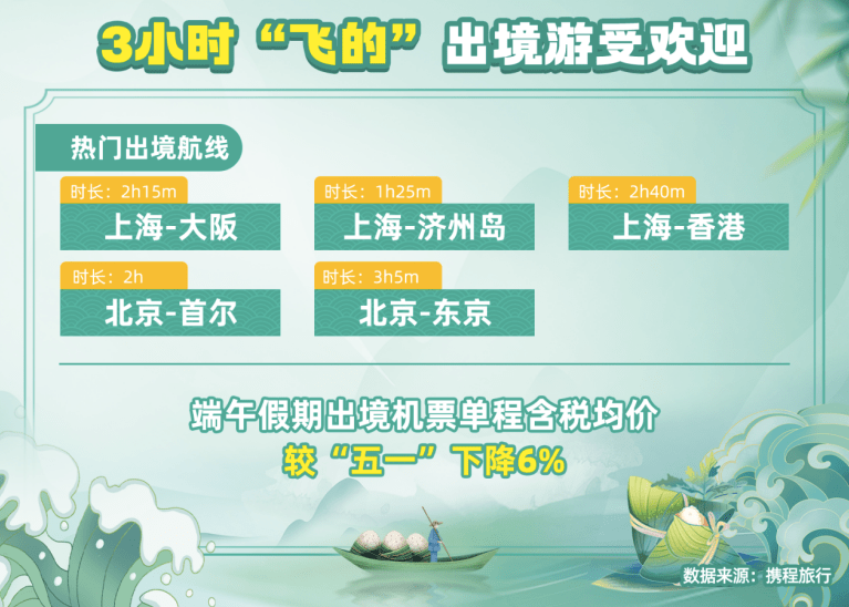 携程数据显示,端午假期,出境游预订同比增长超12倍。截至目前,携程平台上,端午假期出境单程机票含税均价比 五一期间降低约6%,出境旅行成本正在降低。