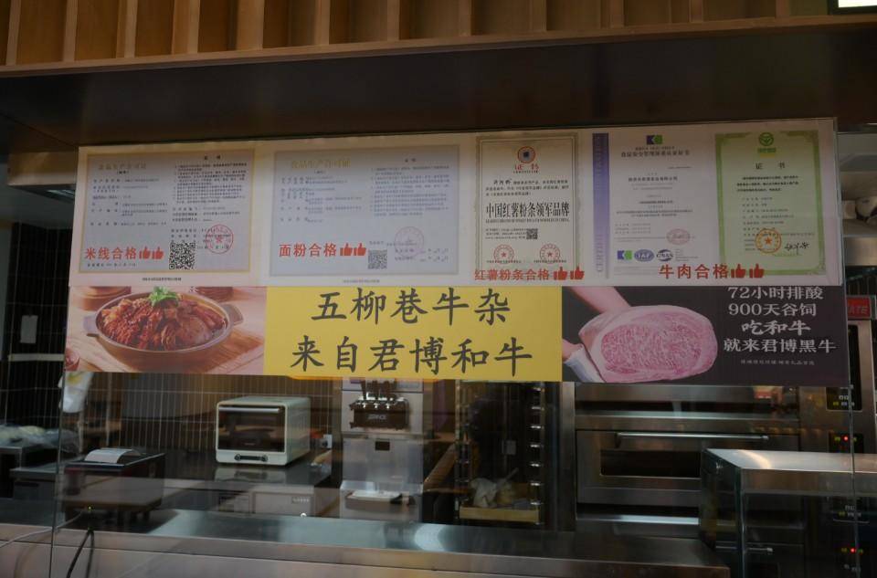 在厨房外的透明玻璃上,还贴有门店主要原材料的合格证,包括米线、面粉、粉条和牛肉,消费者更加一目了然。“我们牛杂来自君博和牛,采用的是900天的谷饲牛肉,经过72小时排酸后配送到门店,品质绝对有保障,牛杂煲已经成了我们门店的招牌。”