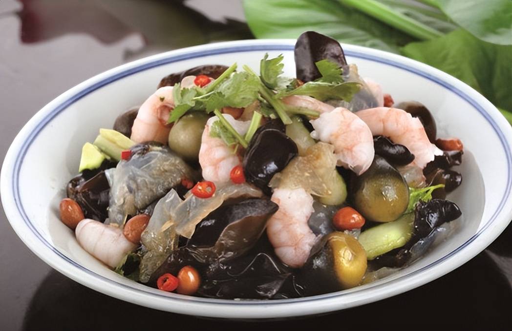 这道菜是一道很好的下酒菜。它选择了六种不同的成分,主要包括水母头、虾、皮蛋和花生。与老醋汁混合后,入口酸甜开胃。几种成分入口后具有特殊的层次感。