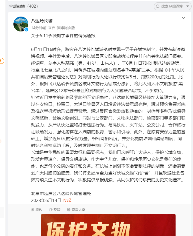 八达岭长城官方微博消息,6月11日16时许,游客在八达岭长城游览时发现一男子在城墙刻字,并在社交媒体发布视频。事件发生后,八达岭长城景区立即启动执法程序并向有关执法部门报案。经调查,刻字人种某强(男,41岁,山东人),于6月11日7时许到八达岭游玩,行至北七至北八之间,用钥匙在城墙内侧刻划名字“种某强”三字。根据《中华人民共和国治安管理处罚法》对刻划行为人处以行政拘留5日、罚款200元的处罚。此外,根据《八达岭长城景区破坏文物行为惩戒办法》,将此人列入不文明旅游“黑名单”,延庆区12家等级景区将对刻划行为人实施联合惩戒、不予接待。