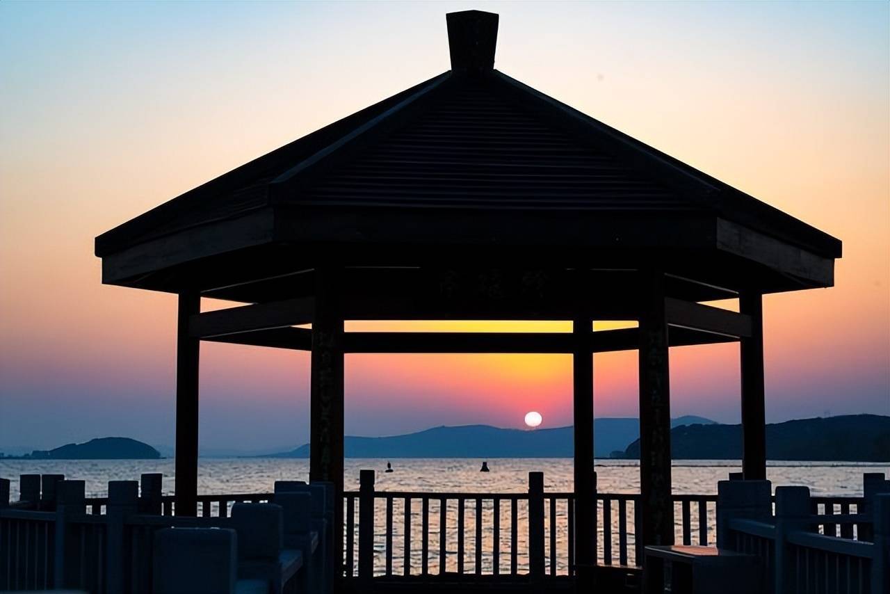 在中犊山内,也有一座湖心亭,这座湖心亭虽然不是什么古建筑,但与传统湖心亭相比,造型极为独特,它是以长长的栈桥,从两边连通到湖心亭,亭子在湖中,就像是一颗项链上的坠子,成为视觉的焦点,更重要的是,从这座亭子望出去,可以看到鼋头渚的灯塔、鼋头,以及远处湖面上的太湖仙岛,而在这里看夕阳,成为环太湖的各类亭子中,夕阳最美的所在。