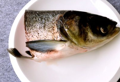 鱼头洗干净沥汗水,放入盘子,均匀的在鱼身上抹上3g盐,腌制一会