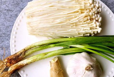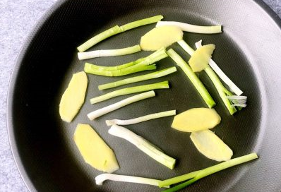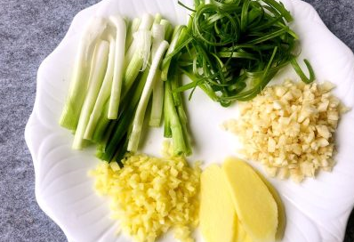 葱洗干净,葱白部分切长段,葱绿部分切成葱丝,姜20g切成姜末,20g切成姜片,蒜去皮切末