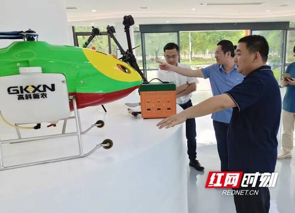湖南植保无人机技术有限公司董事长王魁广(右一)给客人介绍无人机产品。