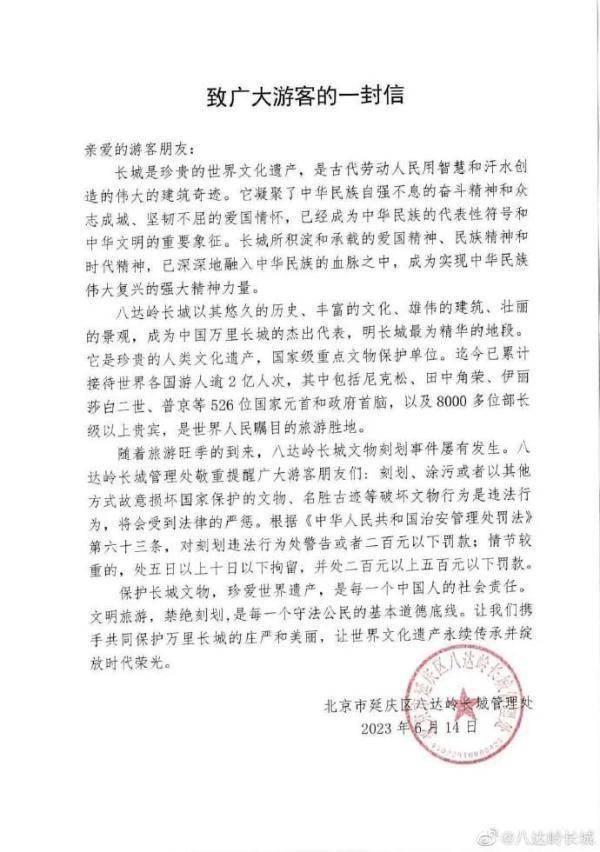 长城是中华民族的重要象征和重要标志,我们再次呼吁广大游人,保护长城文物,珍爱世界遗产,倡导文明旅游。作为中华儿女,保护和传承历史文化是我们的使命,也是每个公民的责任和义务。在长城上刻划不仅会受到法律的制裁,还会遭受到广大同胞们的谴责。我们将会竭尽全力当好长城文物“守护者”,并且欢迎社会各界持续关注不文明行为,积极提供举报线索,共同保护我们珍贵的历史文化遗产。