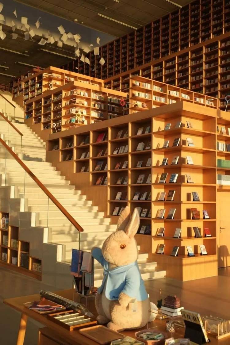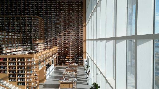 到了夜间,可欣赏窗外落日余晖降于蓝绿湖水之上;而书店依旧明亮,柔和灯光下,耳边只有翻动书页声,阅读乐趣绵长。