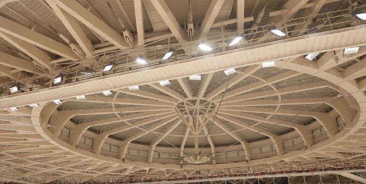 场馆造型格外吸引人眼球。主体建筑从结构原型、建筑外观等多方面重构“自行车车轮”的意象,诠释自行车运动的速度感;立面采用双曲内凹曲面的造型,形成富有韵律感的整体形象,诠释芦苇的意象。