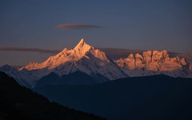 ▲2023年3月10日日出时分拍摄的梅里雪山,皑皑雪峰在金色晨光映照下如披金纱。图/新华社