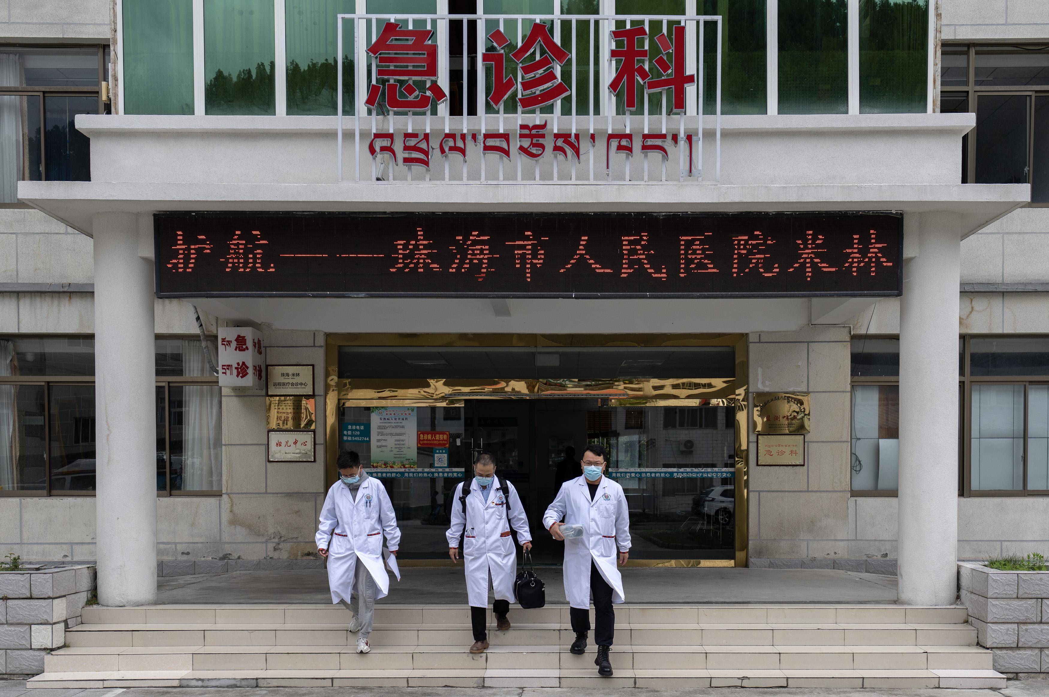 6月12日,王振疆(中)、尼玛益西(左)和王彤旭走出米林市人民医院的急诊大楼。