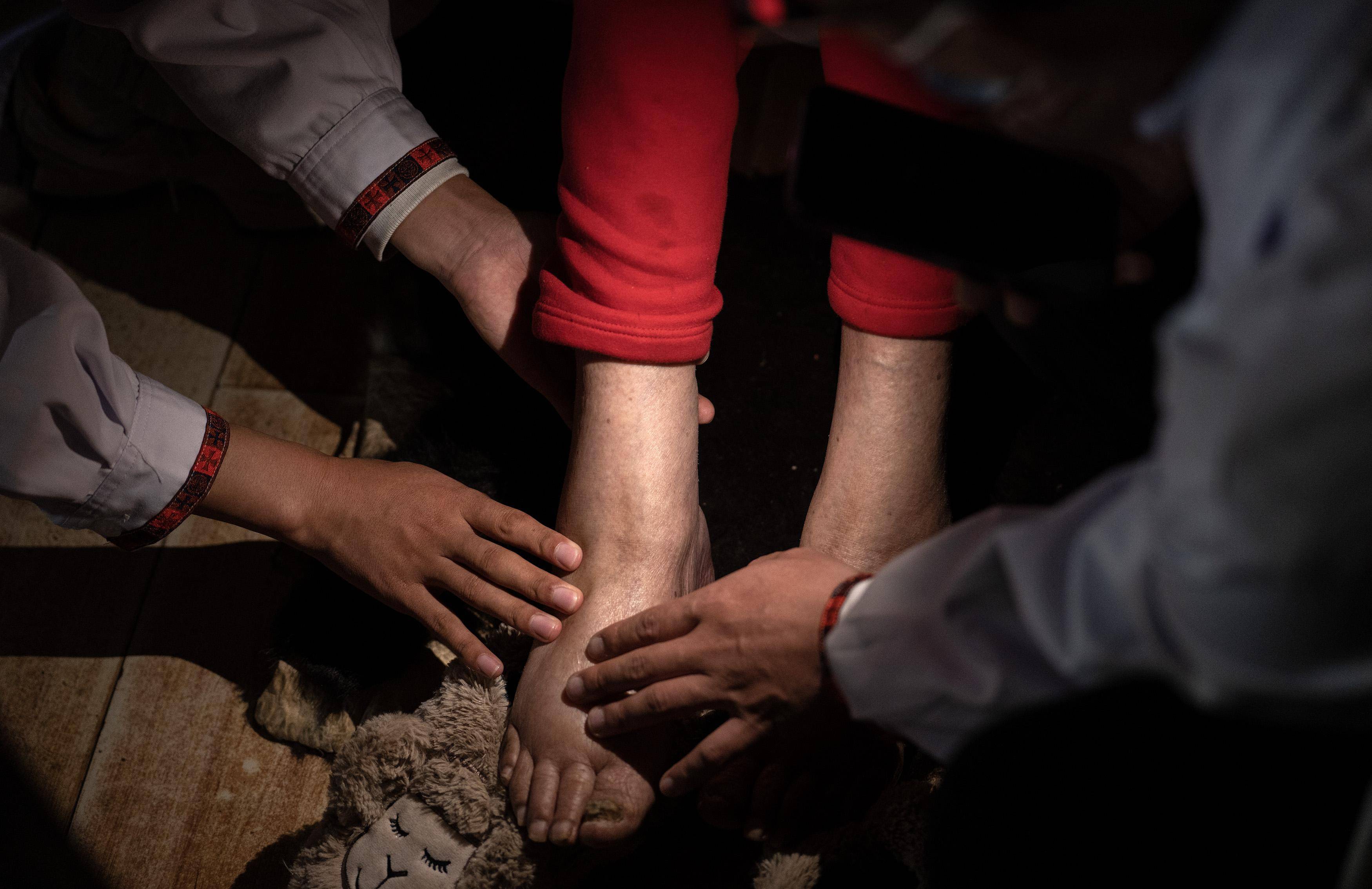 随后,王振疆医生又开始认真地检查娘姑的脚,她的脚面和脚趾肿胀得很厉害。