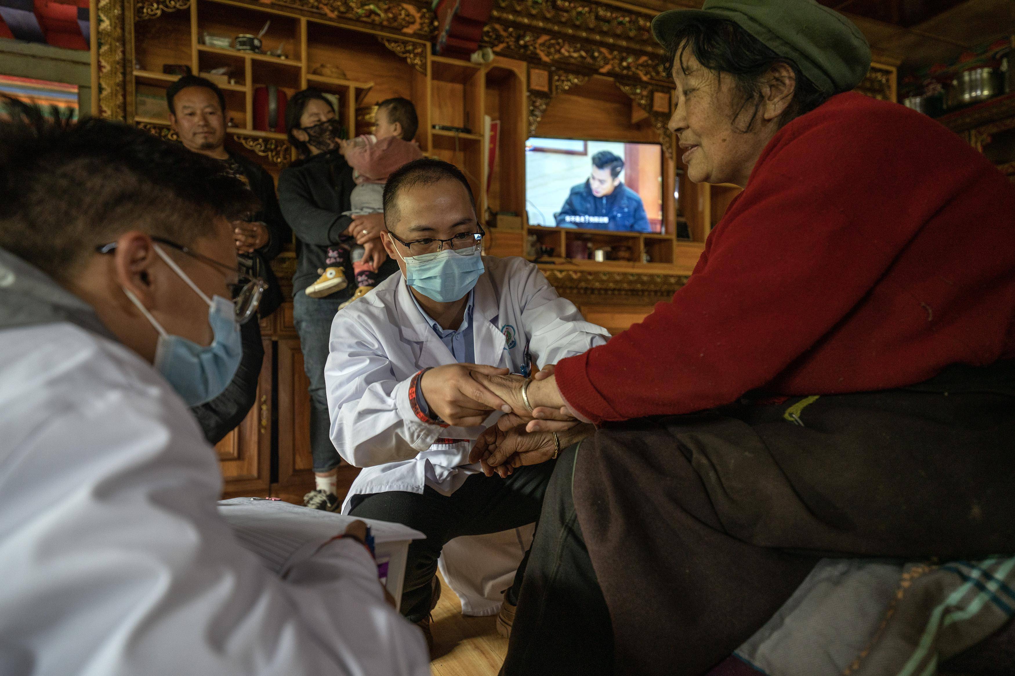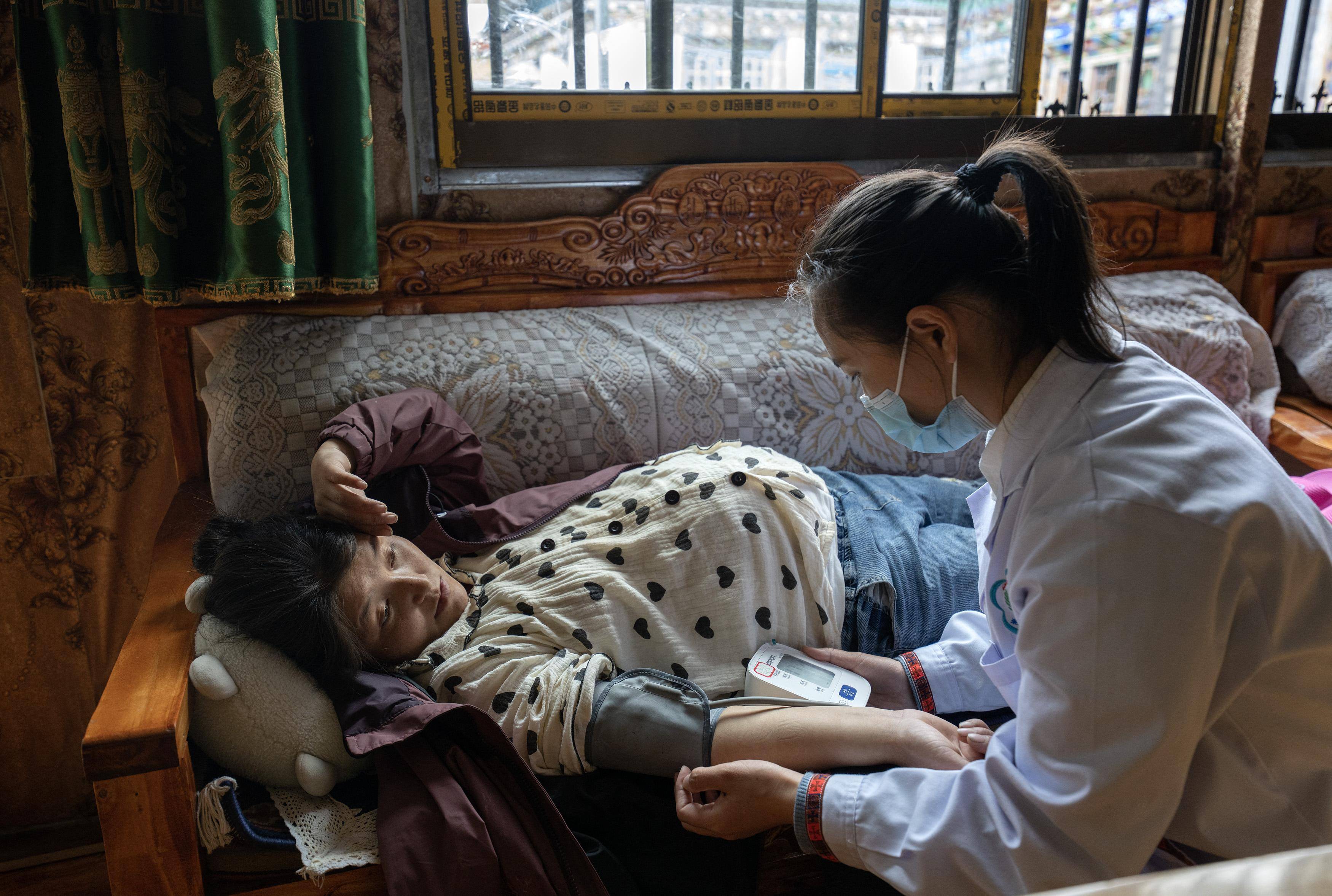 6月12日,王振疆(右)为吞不绒村89岁的村民娘姑进行检查。