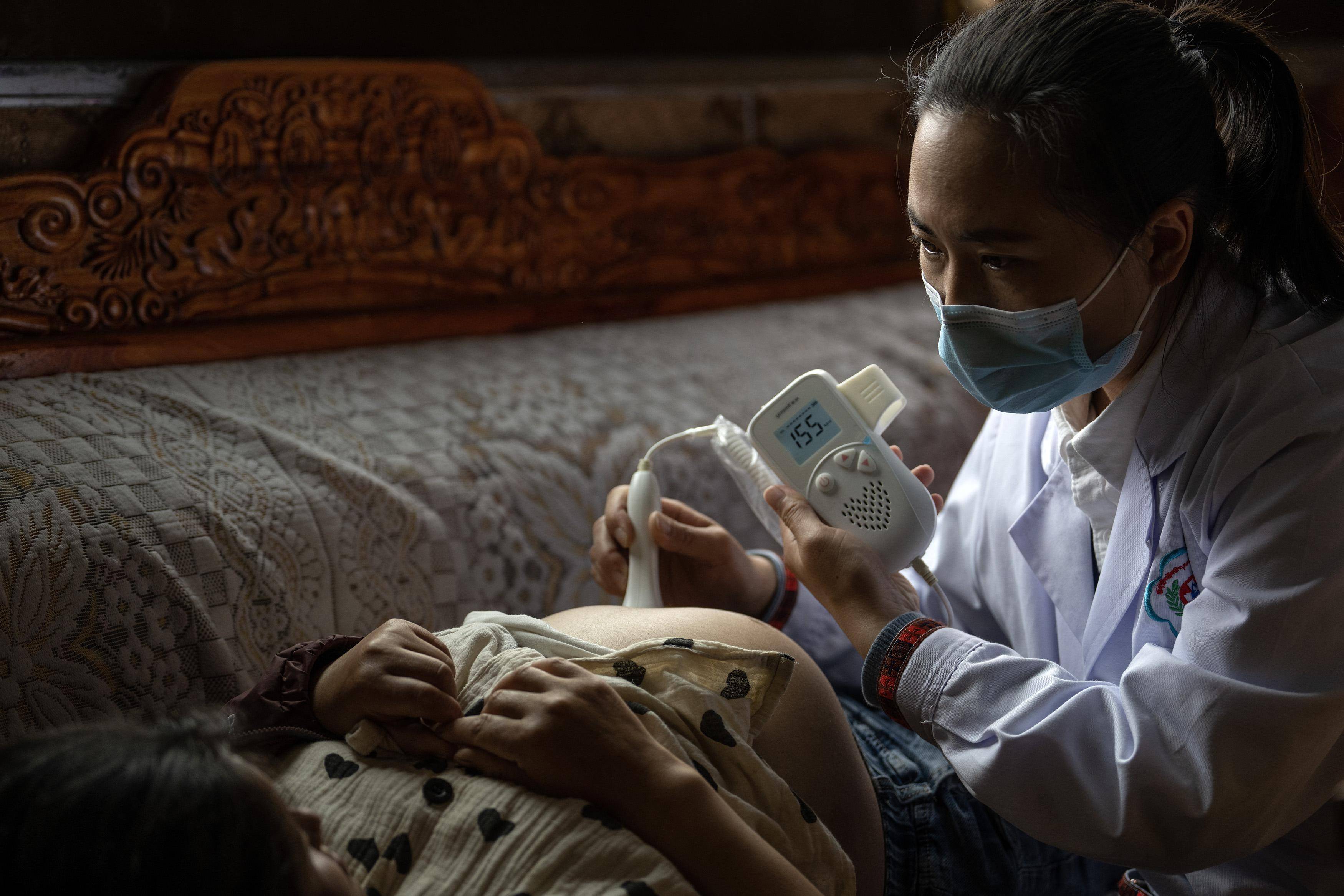6月12日,陈冰(右)在为怀孕38周的扎西央宗进行产检。
