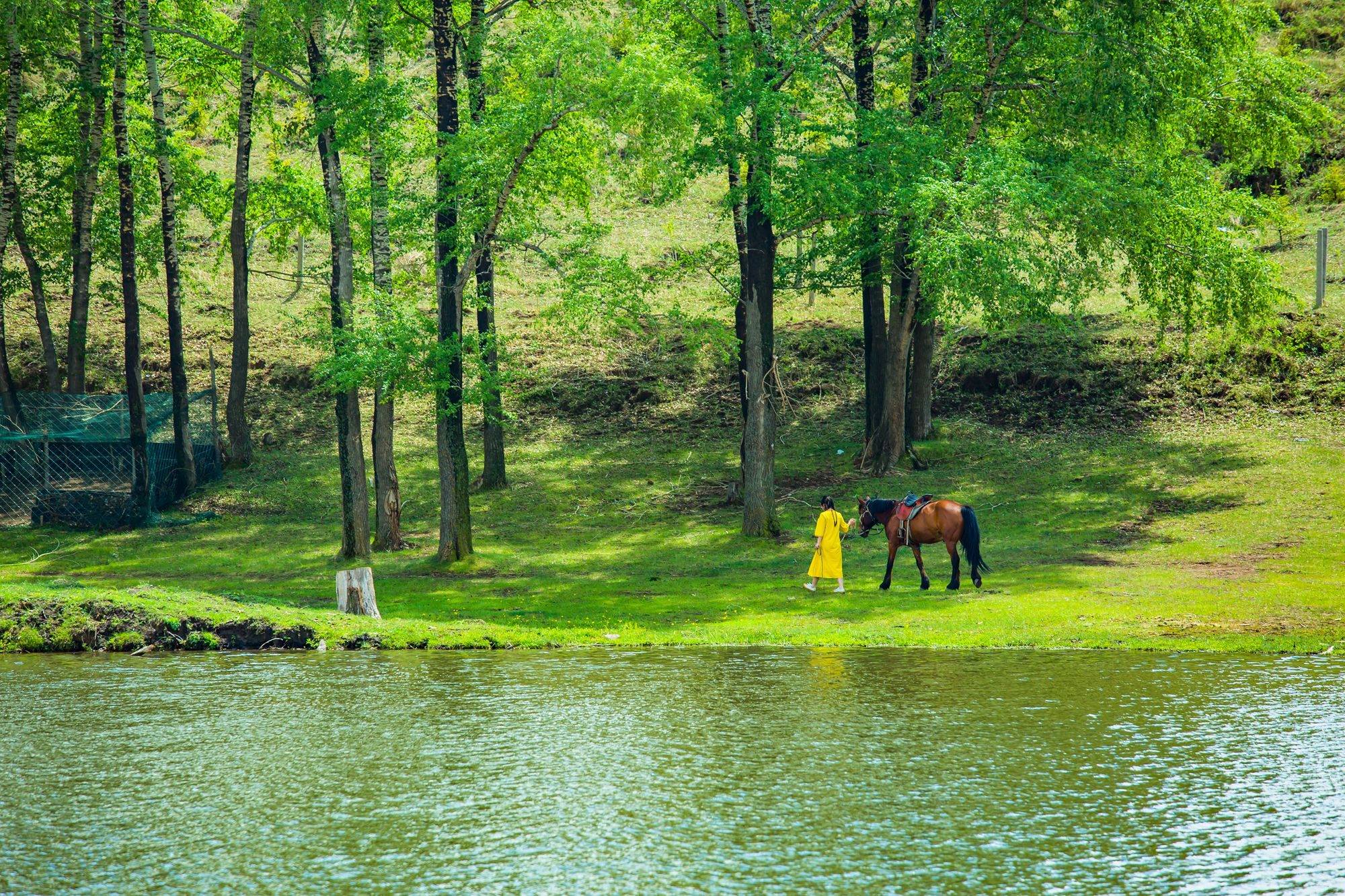 波光潋滟、倒影如画的湖泊演绎着夏日草原的浪漫,在湖畔边牵马缓缓前行,身边是森林,远处有开满鲜花的草原,让人在游览之余,多了几分悠远之思。