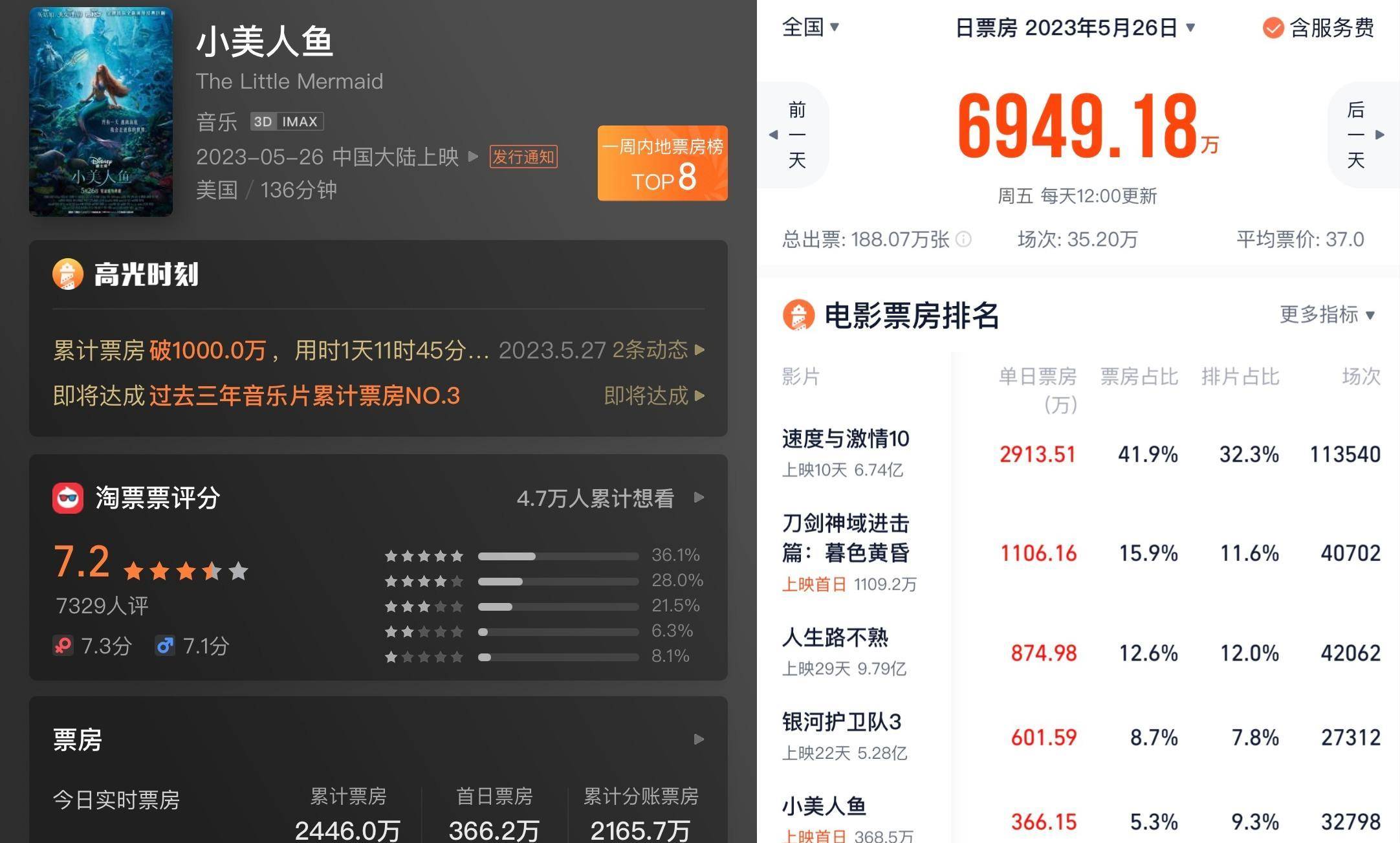 《小美人鱼》在中国内地上映首日仅收获360百万票房,不仅与北美差距巨大,在国内也排名第五,优于《长空之王》。在那之后,这辆车起伏不定,在发布的第一周仅获得了2400万积分。