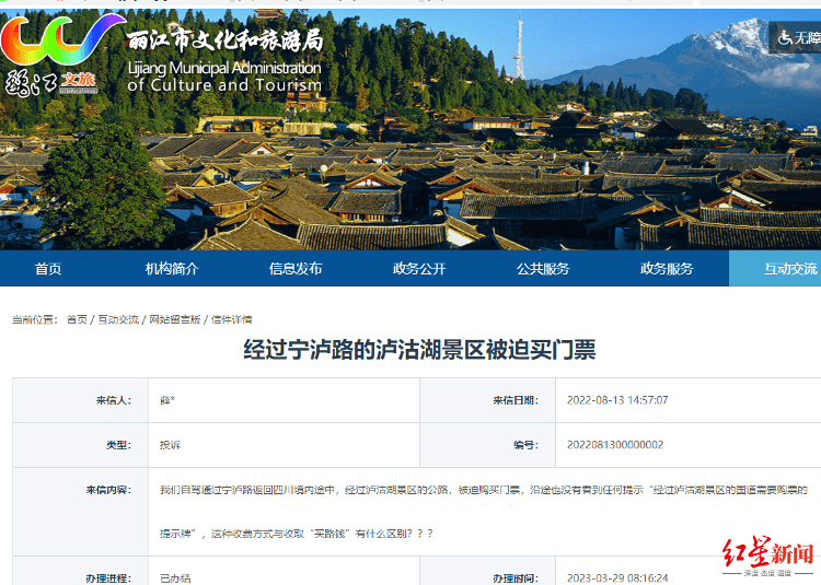 2022年8月,曾有网友在丽江市文旅局官网留言投诉,“我们自驾通过宁泸路返回四川境内途中,经过泸沽湖景区的公路,被迫购买门票,沿途也没有看到任何提示‘经过泸沽湖景区的国道需要购票的提示牌’,这种收费方式与收取“买路钱”有什么区别?”